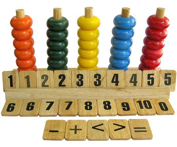 Bằng gỗ. KT đế (260x63x24), đảm bảo tiêu chuẩn an toàn. Bàn tính gồm 5 cọc có chân đế. Mỗi cọc có tối thiểu 6 hạt bàn tính được sơn màu khác nhau. Một bộ chữ số gồm :
