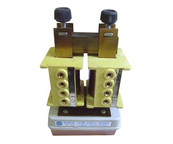 Gồm: 2 cuộn dây đồng một cuộn dây Ф0,5mm quấn thành 200vòng+200vòng; một cuộn dây Ф0,5mm quấn thành 400vòng+200vòng (cả hai quấn trên cốt bằng nhựa HI có 4 lỗ ra dây bằng đồng Ф4mm). Lõi thép chữ U và chữ I bằng tôn Silic tiết diện ngang (20x20)mm được ép sát bằng gông thép và đinh tán; lõi U-I được ghép kín mạch từ bằng 2 vít hãm M6 có thể tháo lắp được rời nhau. Tấm đế bằng nhựa HI màu đen kích thước (104x74x19)mm, dày 2,5mm.