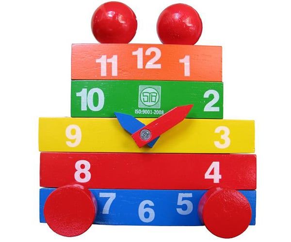 • Bằng gỗ đảm bảo tiêu chuẩn an toàn, gồm các khối : bánh xe (F35x20 = 4) ; khối chữ nhât (150x18x25 = 3), in các số mặt hông : 9,3 ; 8,4 ; 7,6,5 ; Khối chữ nhật (105x18x25) in các số mặt hông : 11,12,1 ; 10,2. Hình cầu (d=35), kim ngắn và kim dài. Các hình khối có thể ghép chồng lên nhau thành đồng hồ.