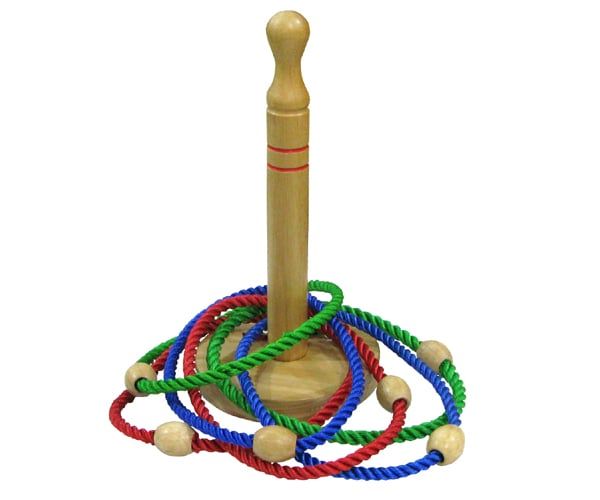 Vật liệu bằng gỗ và nhựa, gồm: - Cọc được gắn trên đế chắc chắn cao khoảng 300mm. - Gồm 6 vòng đường kính của thân vòng 20mm; đường kính vòng khoảng 160mm.